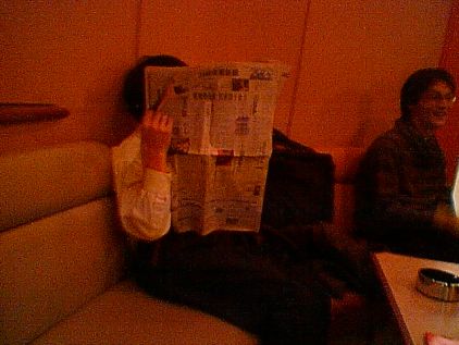 カラオケボックスで日経新聞を読むHさん。